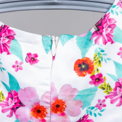Elegant party dress with a whimsical printed yoke and classic charm. Perfect for festive occasions.
