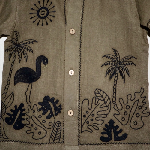 Olive cotton shirt and shorts set with fun flamingo embroidery. Cool, comfy, and perfect for beach days or sunny outings.