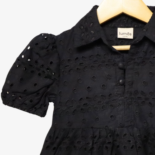 Black Cotton Dress with Hole Embroidery – Girls