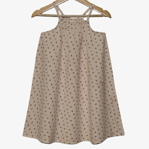 Beige cotton dress with cute cherry prints and comfy straps. Light, breezy, and perfect for sunny days.
