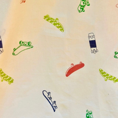 White cotton shirt with fun skater print. Cool, comfy, and perfect for casual days.